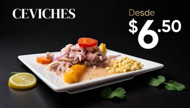 Selecciona entre ceviches, pollo asado y bebidas en nuestro menú.
